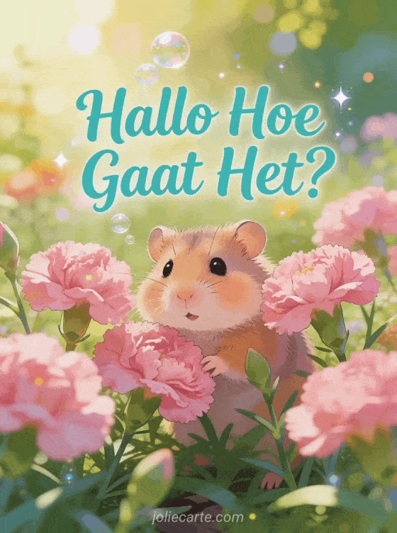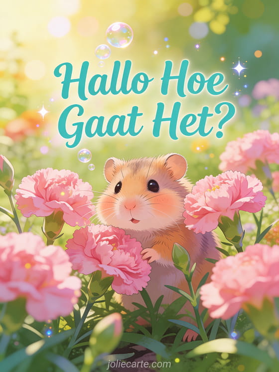 Stuur een vriendelijke en nieuwsgierige groet met een dikwangige hamster die glurt tussen roze anjerbloemen. Bekijk ook een tederheid ochtend goedemorgen of een goedemorgen gifs.