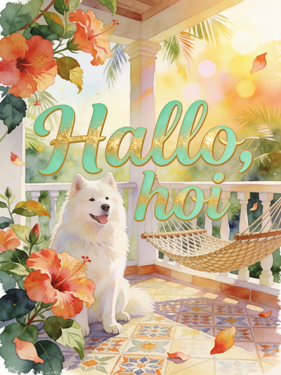 Stuur hallo hoi gif met mintgroene aquarelletters, een Samojeed hond naast hibiscusbloemen, patroontegels, een geweven hangmat en warm ochtendlicht op een tropisch terras. Deel ook een kaart voor schattige hoi kusjes gif, een kaart voor fijne dag hoi goedemorgen gif of een kaart voor hoi goedemorgen gifs.