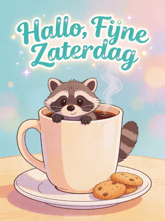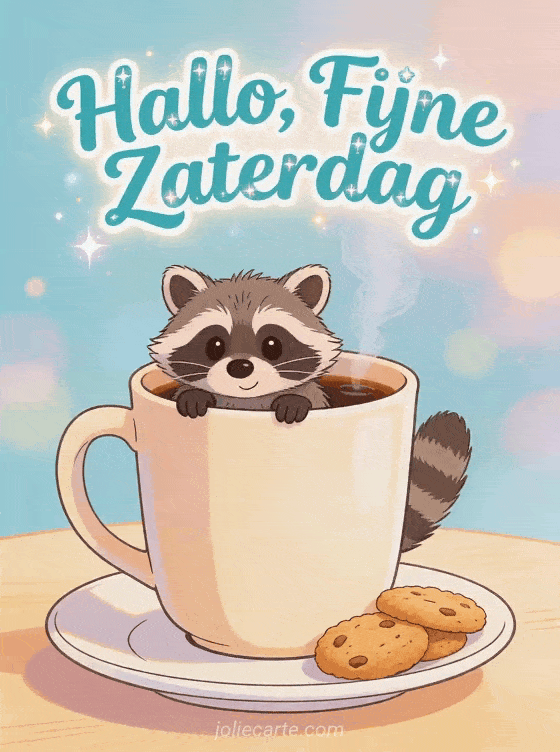 Deel een vrolijke Hallo, Fijne zaterdag met deze gratis kaart waarop een brutale wasbeer uit een grote koffiemok naast koekjes gluurt. Ontdek ook gif fijne zaterdag, grappige geanimeerde fijne zaterdag gifs gif of mooie zaterdag afbeelding.