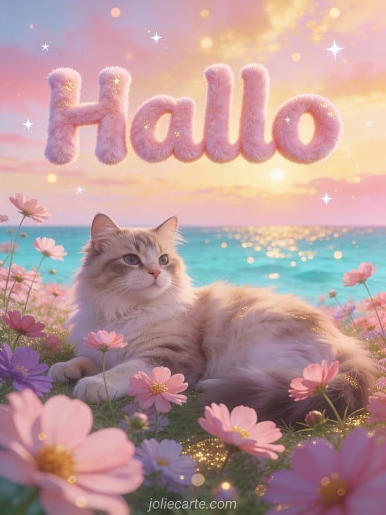 Stuur een warme en tedere kaart met een pluizige Siberische kat tussen roze en paarse cosmosen om iemand een lieve goedemorgen te wensen. Bekijk ook een kat die goedemorgen zegt, goedemorgen humor afbeelding of kaart goedemorgen ochtend.