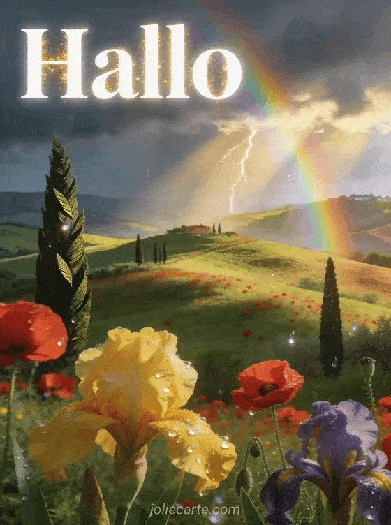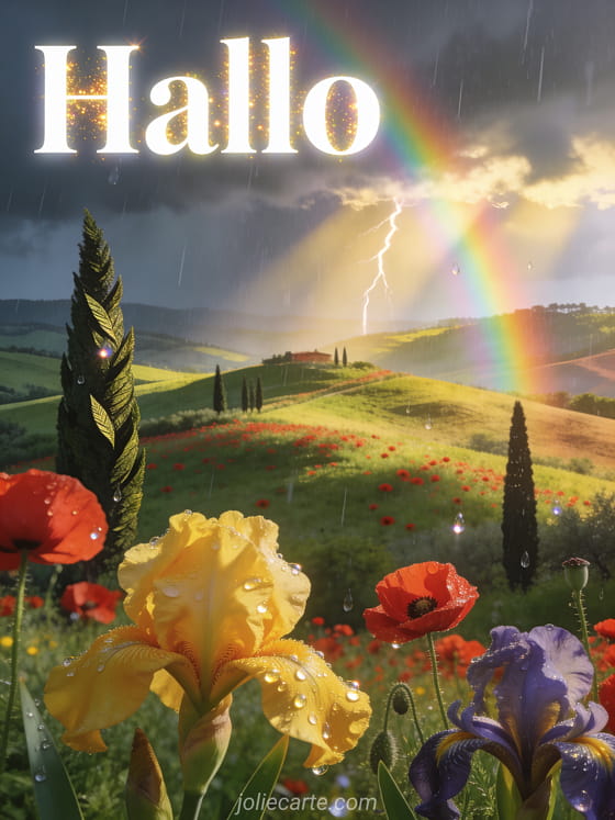 Stuur een prachtige kaart met groene Toscaanse heuvels vol rode klaprozen en gele irissen en een regenboog om je dochter warm hallo te zeggen. Bekijk ook een hallo stel gif, hallo bloemen gif of afbeelding hallo oktober.
