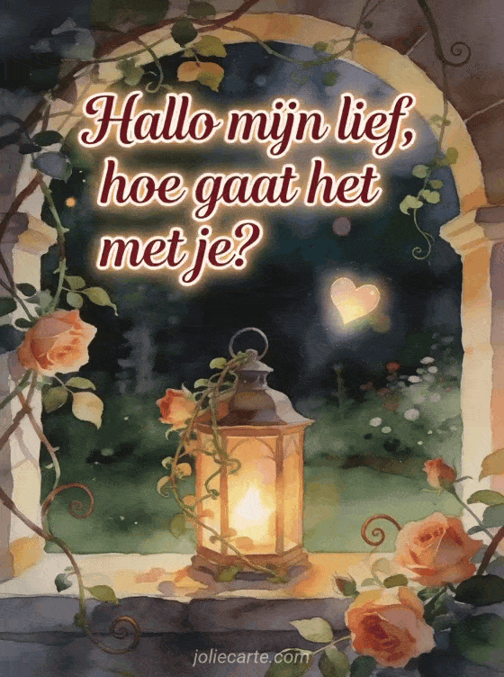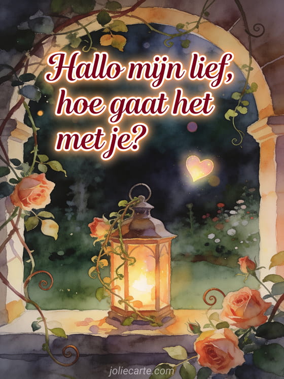 Deel een romantische en tedere groet met oude rozenranken rond een gloeiende lantaarn in een tuinnis, amberkleurig licht en hartglans. Je kunt ook gaat het goed mijn kleine lieverd, goedemorgen mijn lief hoe gaat het met je vanochtend of hoe gaat het lieverd sturen.