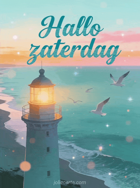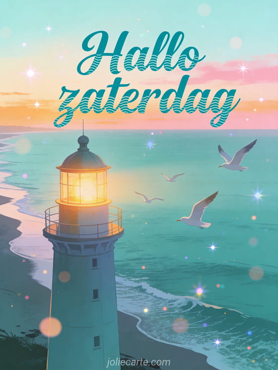Stuur een serene hallo zaterdag groet met oceaangroene letters, een vuurtoren bij zonsopgang en meeuwen boven een vredig kustlandschap. Ontdek ook een kaart voor maak er een fijne zaterdag van, een fijne zaterdag kaart met dikke kus of een mooie fijne zaterdag afbeelding.