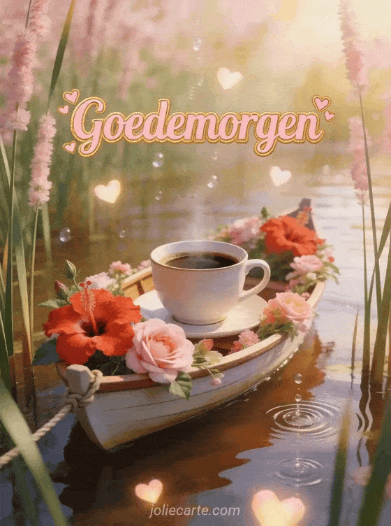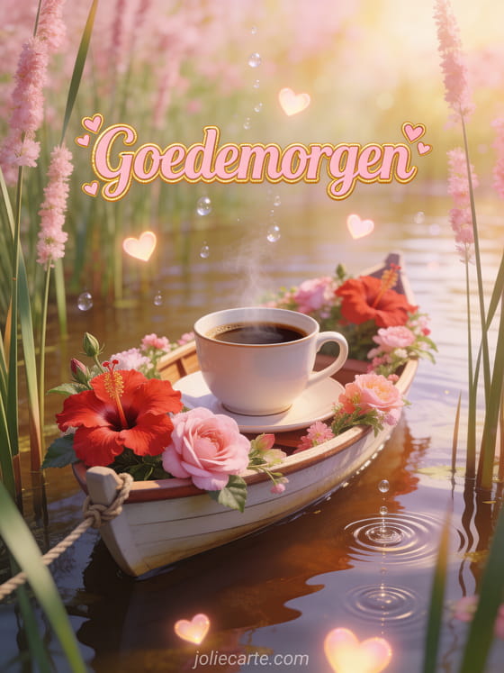 Stuur een magische goedemorgen koffiekaart met een boot vol bloemen en hartjes. Ontdek ook een glimlach fijne dag koffie voor nog een mooie ochtendkaart.