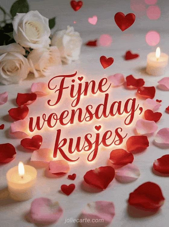 Stuur tedere kusjes voor fijne woensdag met rode en roze hartvormige rozenblaadjes, delicate witte rozen en warme kaarslichtromantiek. Ontdek ook goedenacht en fijne woensdag, fijne woensdag clown of kleine fijne woensdag afbeelding.