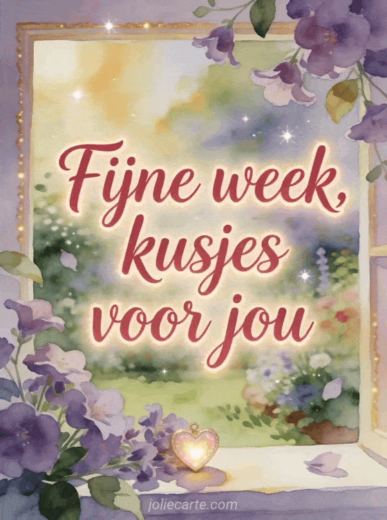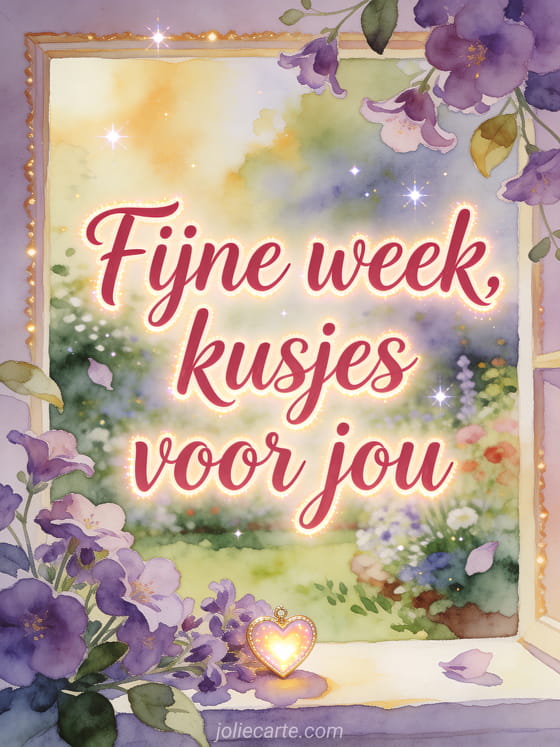 Deel een zachte fijne week boodschap met karmozijnrode kalligrafie, een lichtgevend hart, viooltjes en warm tuinlicht. Ontdek ook kusjes tederheid fijne week, mooie afbeeldingen fijne week kusjes of fijne week allemaal kusjes afbeeldingen.