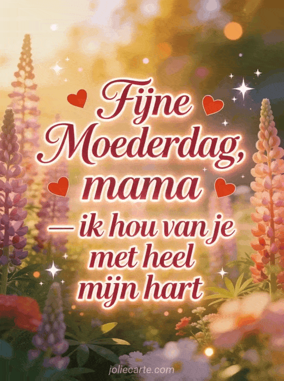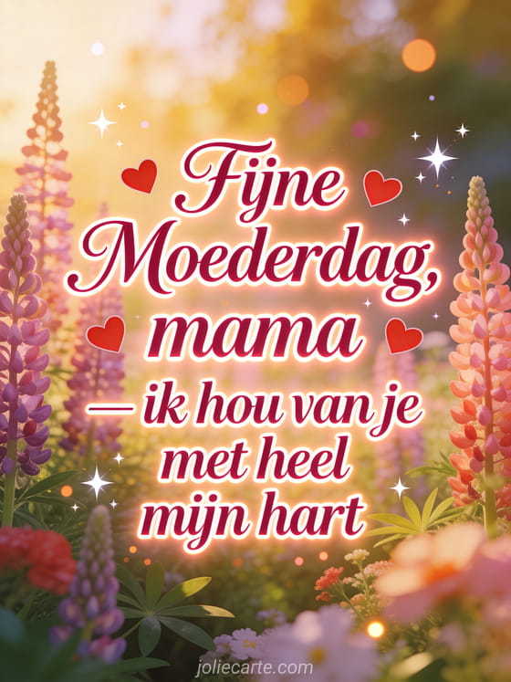 Zeg mama dat je van haar houdt met heel je hart met deze prachtige hart moederdagkaart met dieproze elegante tekst en bloeiende lupines in een droomtuin. Ontdek ook een gratis moederdag kaart of moederdag afbeeldingen.