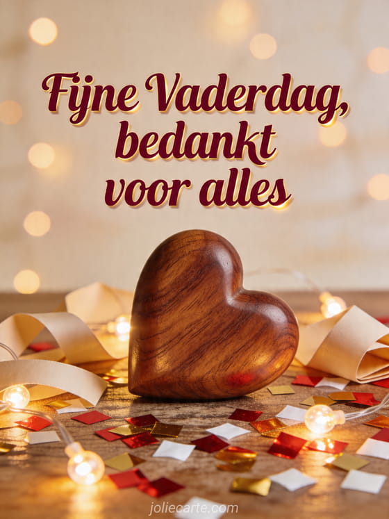 Stuur een hart Vaderdagkaart met dieprode robijnletters, warme gouden accenten en een gepolijste houten hartsculptuur omringd door kleine lichtjes, gevouwen lint en heldere confetti op een getextureerde tafel. Ontdek ook fijne feestdag papa en mama, fijne vaderdag aan mijn zoon of een gratis vaderdag afbeelding.