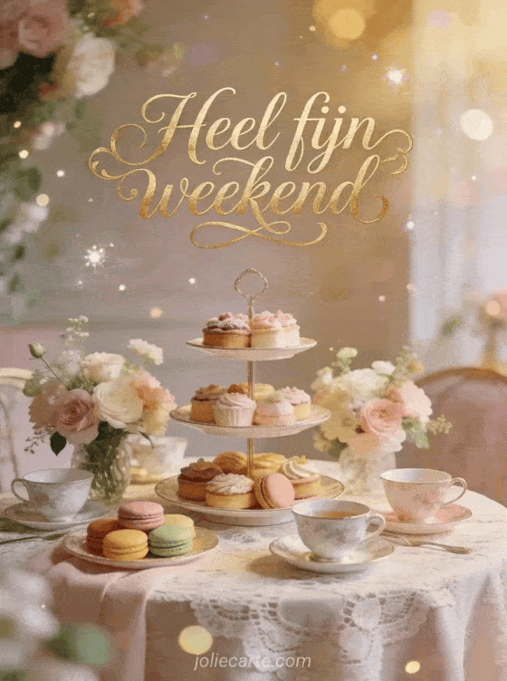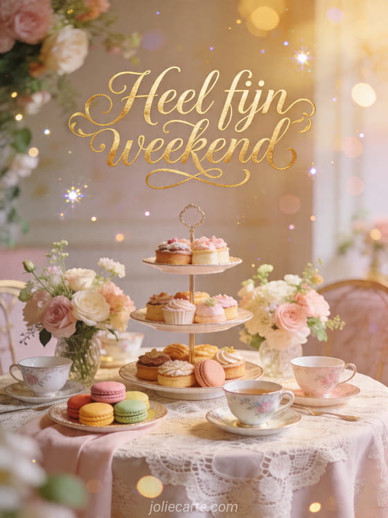 Deel een verfijnde weekendgroet met deze elegante kaart vol theetijd, bloemen en delicate macarons. Ontdek ook fijn weekend positief, fijn weekend doorbrengen of afbeelding fijn weekend zen.
