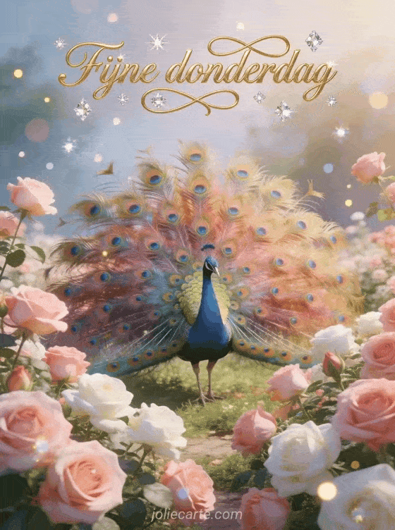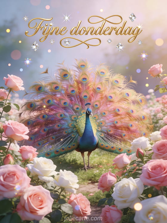 Deel een koninklijke donderdaggroet met een prachtige pauw die zijn veren uitspreidt in een bloeiende rozentuin. Ontdek ook een kaart fijne donderdag of een goedemorgen fijne donderdag kusjes kaart.