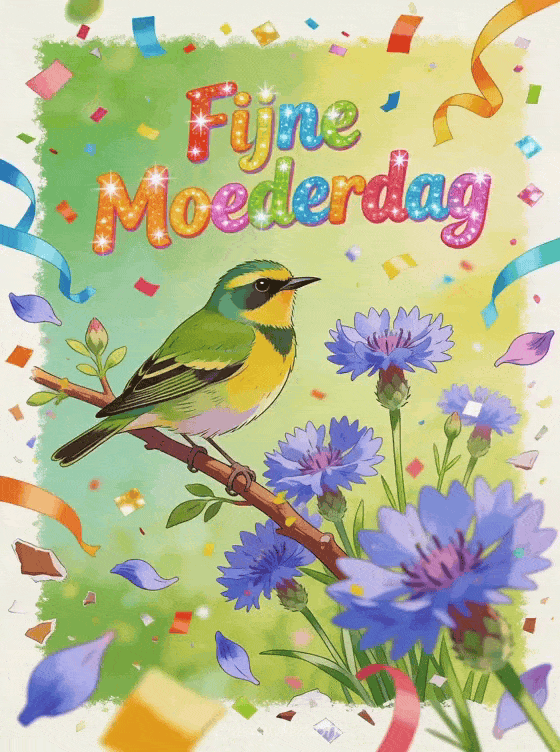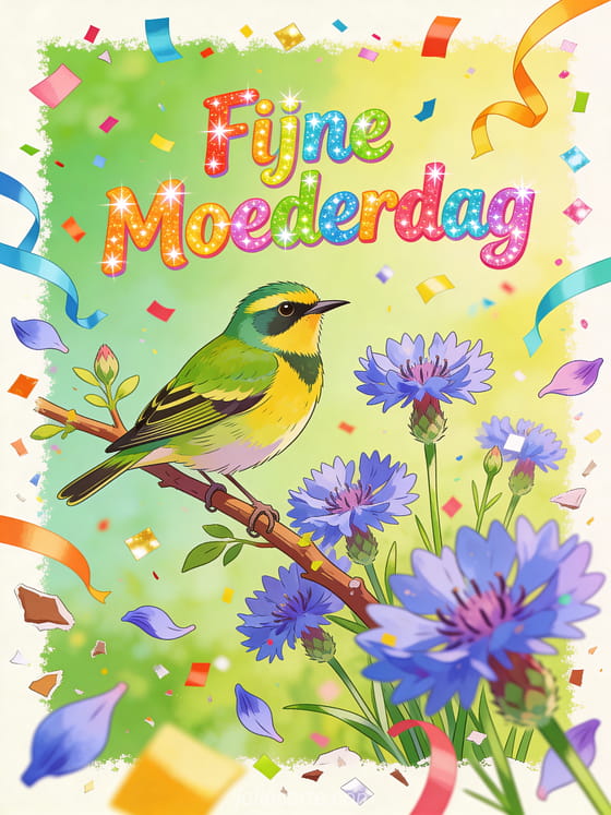 Vier met deze levendige het is moederdag kaart. Een groenling zit op bloeiende korenbloemen in een feestelijke scène met kleurrijk confetti en slingers. Ontdek ook moederdag kaarten gratis of een fijne moederdag kaart.