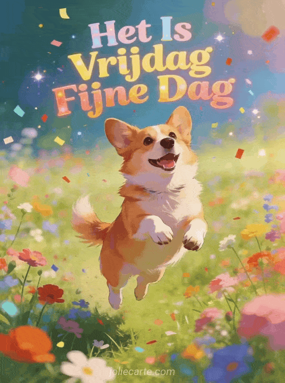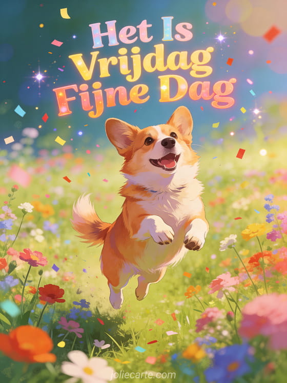 Stuur een feestelijke het is vrijdag fijne dag wens met een gelukkige corgi hond springend in een veld van kleurrijke wilde bloemen. Ontdek ook een hoi fijne vrijdag kusjes kaart of een grappige vrijdag gif kaart.