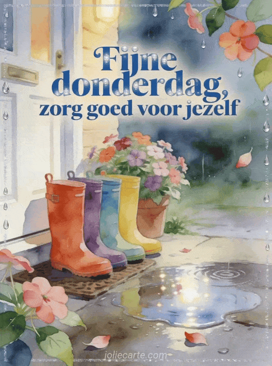 Deel een attente fijne donderdag kaart met een regenachtige voordeur, kleurrijke regenlaarzen, bloeiende impatiens en glanzende plassen. Je kunt ook prettige donderdag kusjes, mooie afbeeldingen voor fijne donderdag of een zonnige fijne donderdag afbeelding sturen.