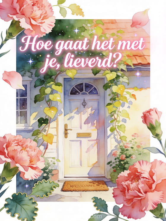 Vraag het met tederheid via roze aquarelletters, anjers rond een geschilderde huisdeur, klimmende bladeren en een kleine deurmat in daglicht. Ontdek ook een hallo hoe gaat het vandaag, een goedenavond lieverd hoe gaat het met je kaart of een hallo hoe gaat het met je vandaag groet.