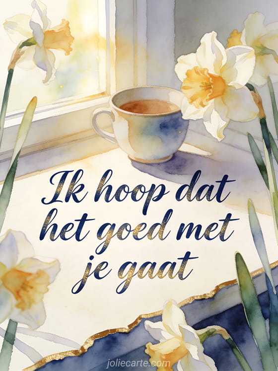 Stuur een fijne zorgzame boodschap met marineblauw aquarelschrift, een keramisch kopje, verse narcissen en een rustige zonnige vensterbank in de ochtend. Ontdek ook een hallo vrienden hoe gaat het, een hoe gaat het met mijn kleinzoon kaart of een hoi mijn liefste hoe gaat het groet.