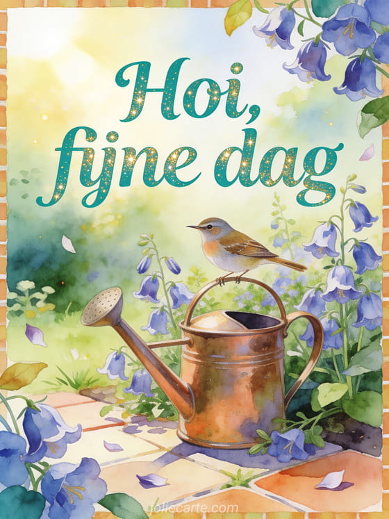 Deel een frisse hoi met smaragdgroene letters, klokjesbloemen over de rand en een nachtegaal bij een koperen gieter op heldere tuintegels. Je kunt ook hoi goedemorgen afbeeldingen, hallo hoi gif of schattige hoi kusjes gif sturen.