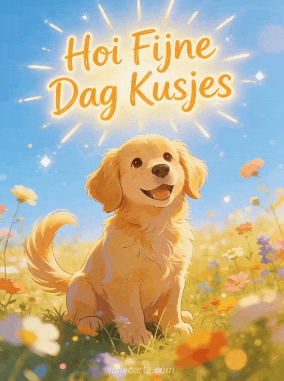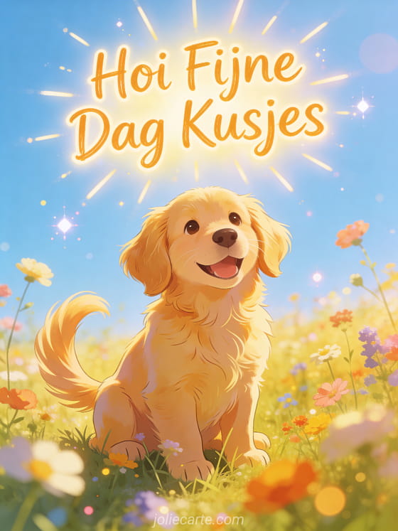 Stuur een vrolijke hoi fijne dag kusjes kaart met een blije golden retriever puppy met kwispelende staart in een zonnige weide vol wilde bloemen en blauwe lucht. Ontdek ook een hoi kusjes kaart of een kuiken hoi kaart of een hoi papa kaart.
