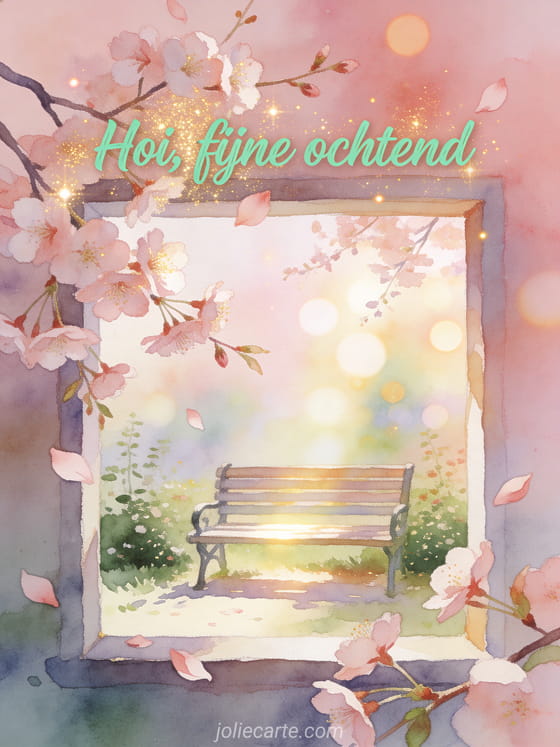 Maak het begin van de dag zachter met deze aquarelkaart, met kersenbloesemblaadjes, tere takken en een rustig bankje in de tuin. Bekijk ook oh hoi, hoi kusjes of kusjes hoi.