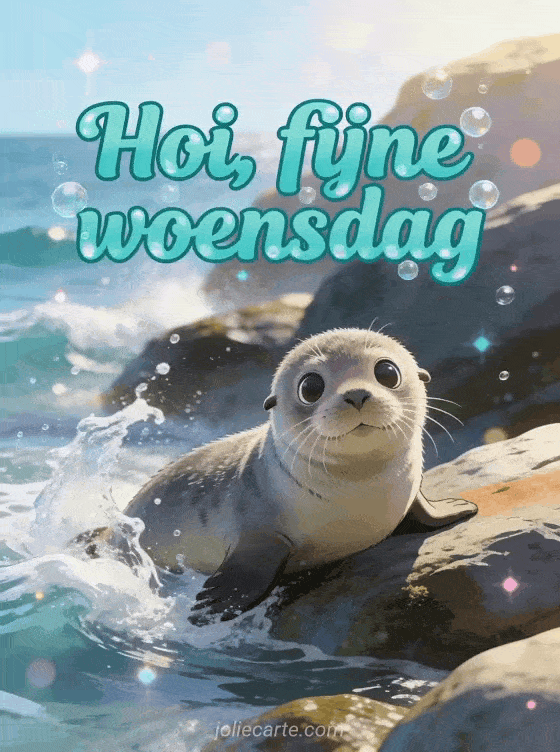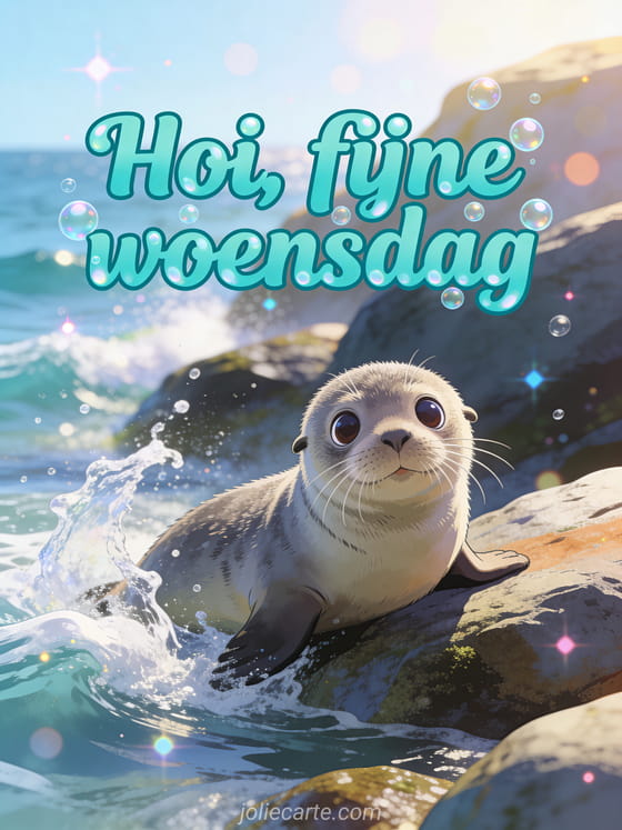 Stuur een schattige fijne woensdag groet met een nieuwsgierige babyzeehond die op rotsen bij de oceaan rust, terwijl golven spatten en waterdruppels schitteren in de zon. Ontdek ook goedemorgen het is woensdag gif, geanimeerde fijne woensdag of fijne woensdag berg.