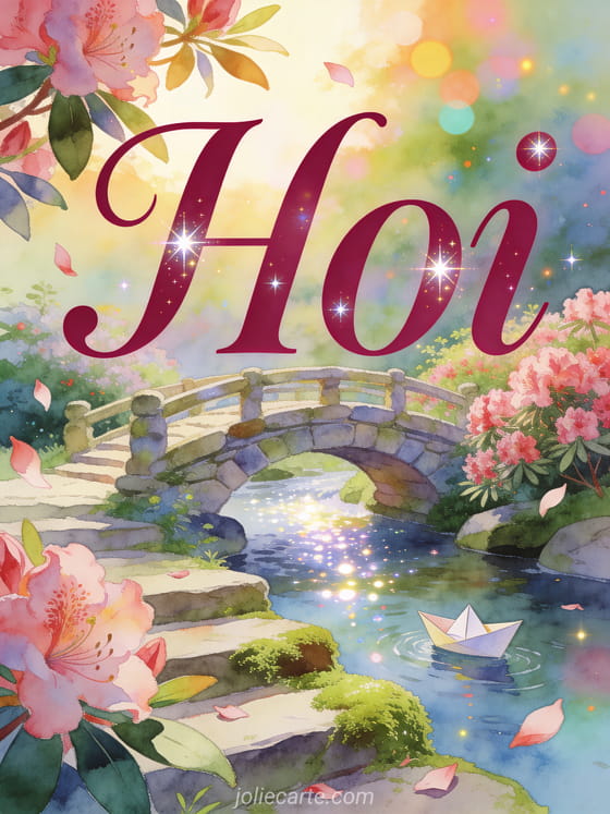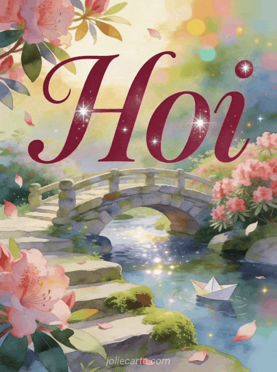Stuur een hoi kaart met een stenen tuinbrug over een glinsterend beekje, rododendrons en een klein papieren bootje in warm middaglicht. Ontdek ook een hoi jij gif, een hoi fijne dag gif of hoi goedemorgen afbeeldingen.