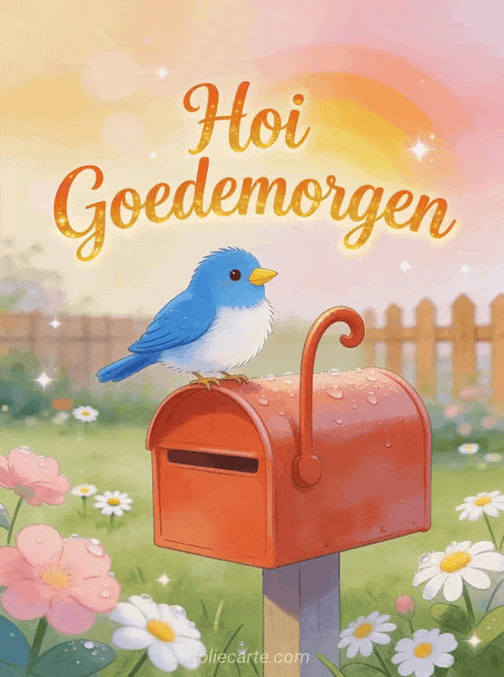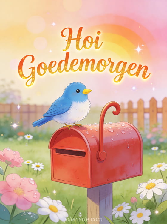 Stuur een vrolijke hoi goedemorgen kaart met een vriendelijk blauw vogeltje op een brievenbus in een gezellige voortuintuin met ochtendlicht en dauwdruppels op de bloemen. Ontdek ook een een klein hoi voor jou kaart of een hoi geel kaart of een hoi grappig kaart.