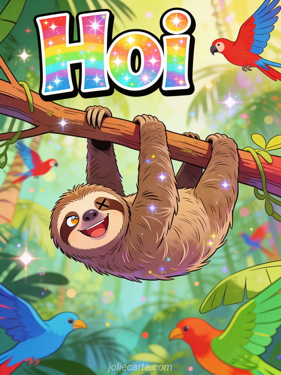 Stuur een komische hoi grappig kaart met een luiaard die een hilarische grimas trekt terwijl hij ondersteboven hangt in een tropische jungle vol kleurrijke vogels. Ontdek ook een een klein hoi kusjes kaart of een klein hoi kaart of een lief hoi kaart.
