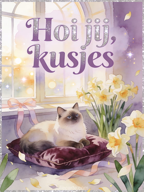Deel een zachte groet met lila aquarelletters, een Birmaan kat op een fluwelen kussen, narcissen, pastelkleurige linten en een zonnig erkerraam. Ontdek ook een kitten hoi, een een lief klein hallo kussen kaart of een hoi goedemorgen tekening groet.