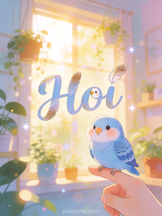 Stuur een zonnige begroeting met een schattige blauwe parkiet met donzige wangetjes op een vinger. Bekijk ook een hoi kusje of een goedemorgen hoi.