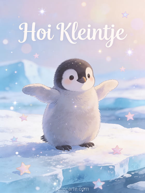 Stuur een adorable hoi kleintje kaart met een baby pinguïnkuiken dat zijn kleine vleugeltjes klappert in een zachte antarctische sneeuwscène met zacht blauw ijs. Ontdek ook een foto's hoi kaart of een een klein hoi kaart of een hoi goedemorgen kaart.