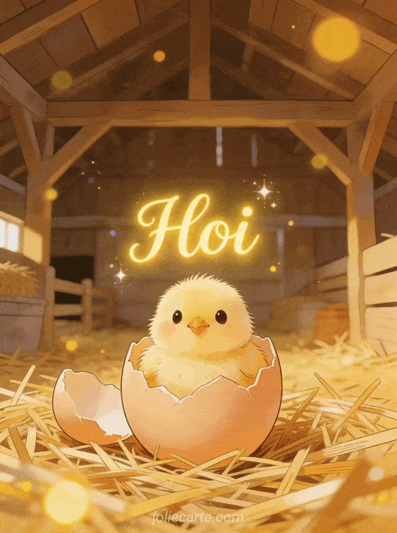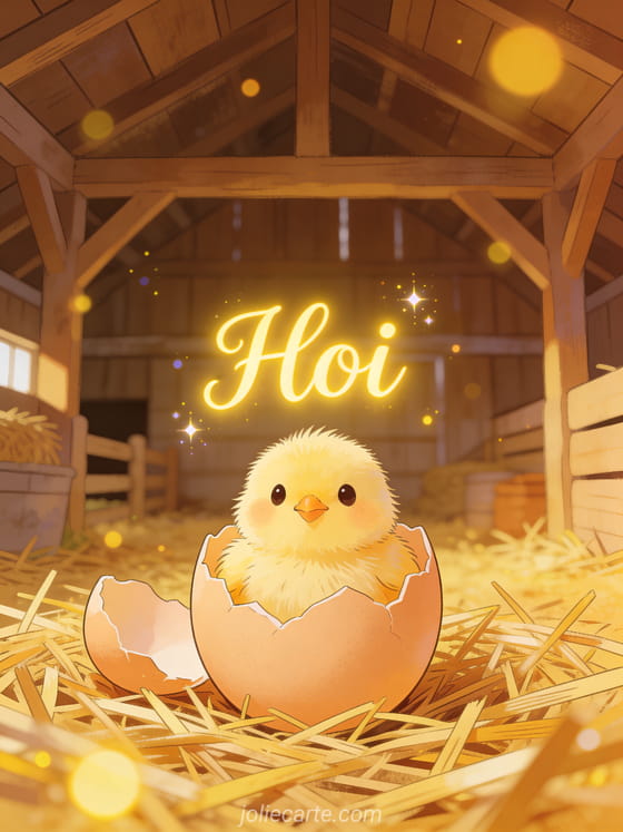 Stuur een adorable hoi kuiken kaart met een tiny donzig kuikentje dat uitkomt uit een ei in een gezellige schuur met stro en warm licht in een vrolijke geboortesfeer. Ontdek ook een kat die hoi doet kaart of een hoi fijne dag kusjes kaart of een hoi kusjes kaart.