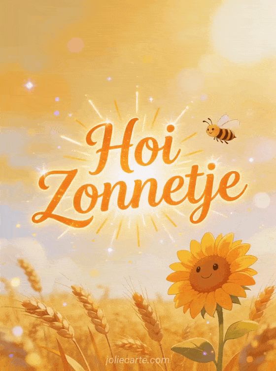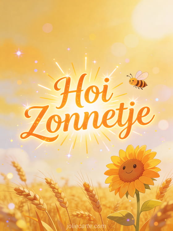 Stuur een radieuse hoi zonnetje kaart met een vrolijke zonnebloem met een lachende bij in een goudkleurig zomertarweveld in stralend zonlicht. Ontdek ook een hoi ik denk aan jou kaart of een hoi kleintje kaart of een foto's hoi kaart.