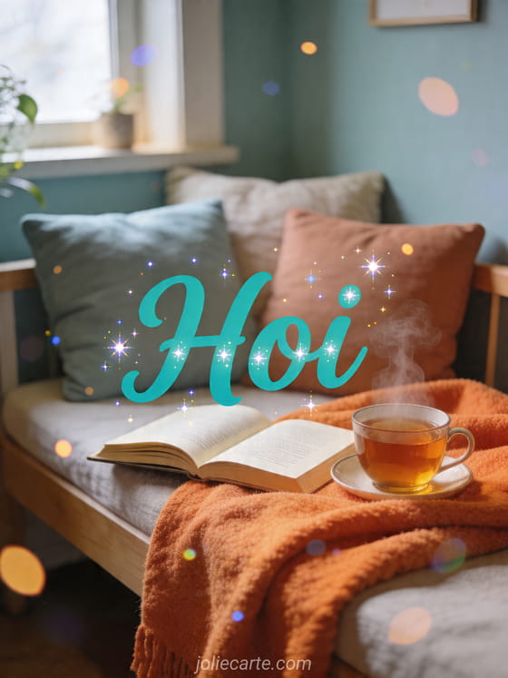 Deel deze kalmerende hoi kaart met een gezellige leeshoek, zachte kussens, een warme deken en een kop thee. Ontdek ook hoi mama, sms goedemorgen vriendschappelijk en goedemorgen aan je geliefde.