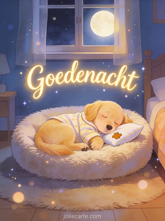 Stuur een knusse goedenavond en goedenacht groet met een hond via deze gratis wenskaart. Een schattige golden retriever puppy in pyjama in een knus hondenmandje met maanlicht. Bekijk ook een vlinder goedenacht of een sms goedenacht schat.