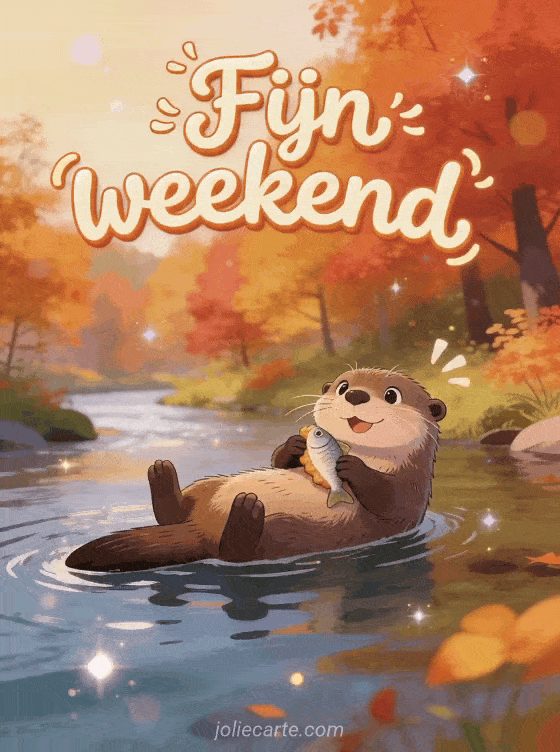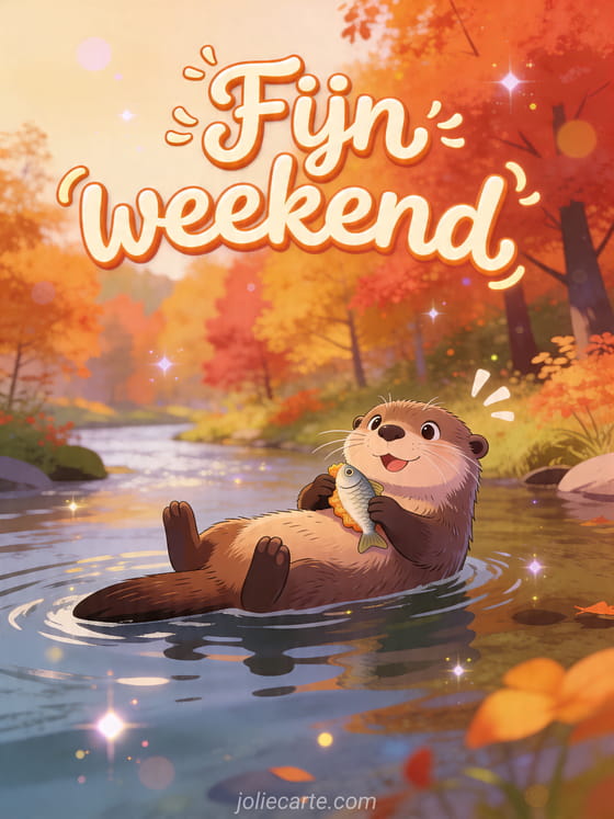 Deel deze grappige fijn weekend kaart met een speelse otter die in de rivier drijft, een vis en herfstbomen. Ontdek ook fijn weekend met humor wensen, geanimeerd fijn weekend gif en een fijn weekend.