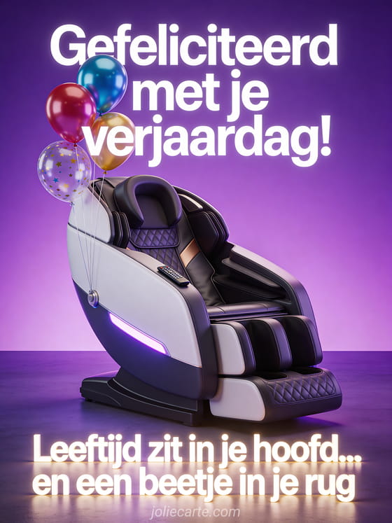 Stuur een grappige verjaardagsgroet over de kleine ongemakken van het ouder worden. Een high-tech massagestoel met verjaardagsballonnen is het perfecte cadeau! Bekijk ook verjaardag fiets humor of gefeliciteerd verjaardag gif vrouw humor.