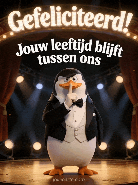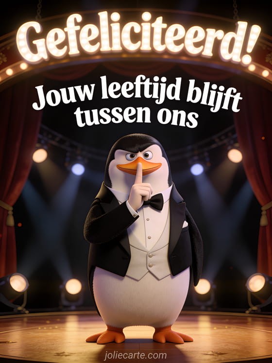 Deel een glimlach met deze humoristische verjaardagskaart met een pinguïn in smoking op een cabaretpodium. Bekijk ook humor gefeliciteerd met je verjaardag, verjaardagskaart humor man of humor citaat verjaardag.