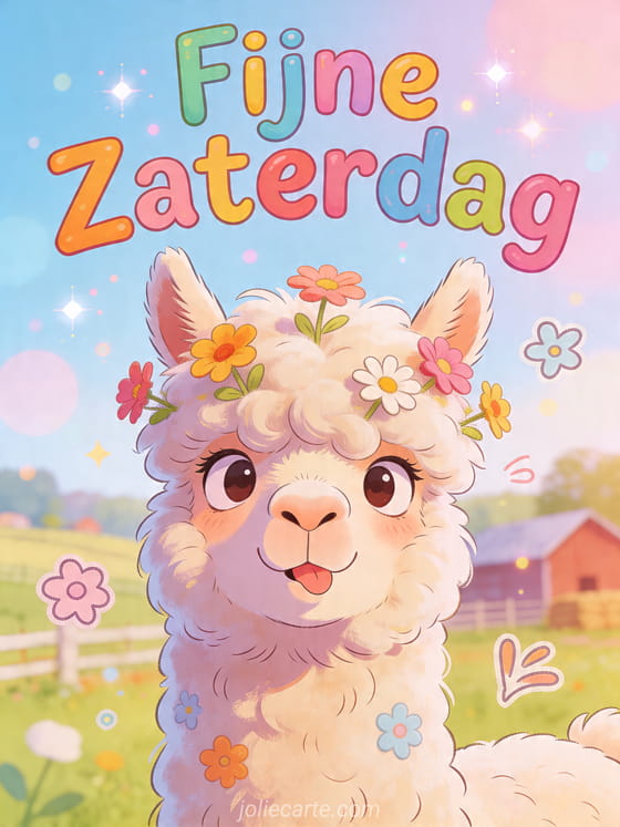 Deel een grappige Fijne zaterdag met deze gratis kaart waarop een pluizige alpaca een gek gezicht trekt met bloemen in de wol op een pastelboerderij. Ontdek ook goedemorgen en fijne zaterdag, fijne zaterdag humor gif of fijne zaterdag geanimeerde gif.