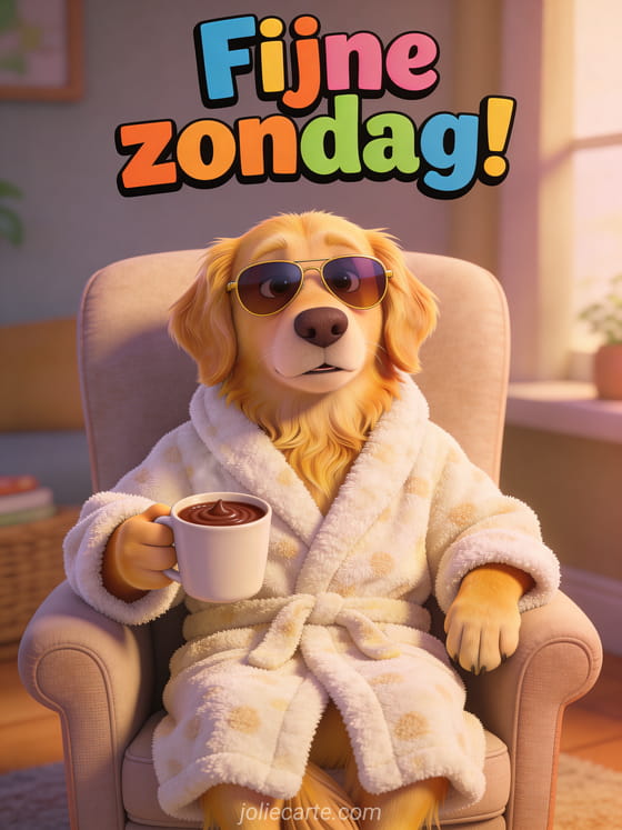 Laat iemand glimlachen met deze grappige fijne zondag met een Golden Retriever in een zachte badjas en zonnebril. Ontdek ook een fijne zondag gratis geanimeerde virtuele kaart, fijne zondag kusjes humor of een fijne zondag doorbrengen.