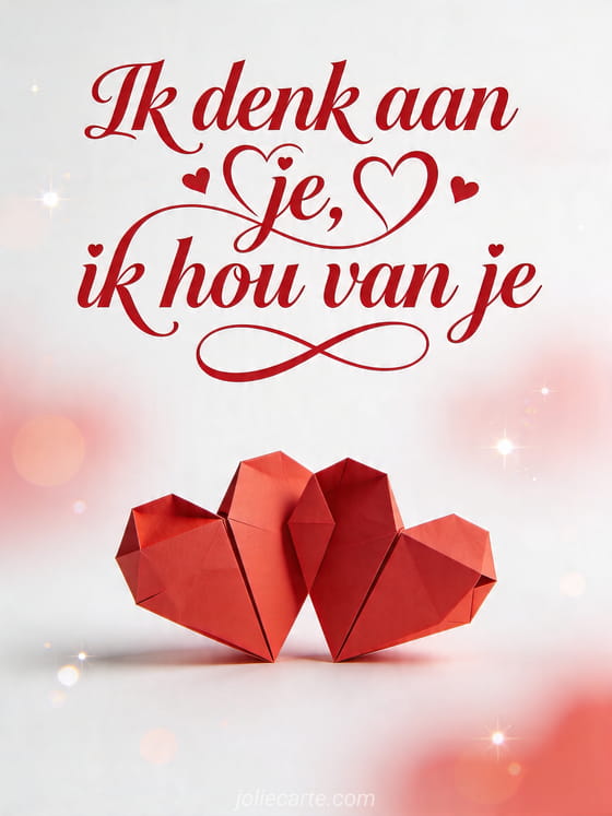 Deel je gevoel met deze romantische kaart en haar verstrengelde origamiharten. Bekijk ook ik denk aan je kusjes, ik denk heel erg aan je mijn liefste of afbeelding ik denk heel erg aan je mijn liefste.