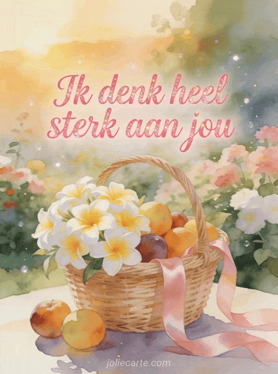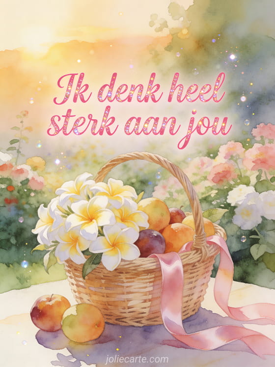 Stuur een warme aquarelkaart met een rieten mand vol witte en gele frangipani bloemen in een bloemrijke tuin om een vriend te laten weten dat je heel sterk aan hem denkt. Bekijk ook een kaart ik denk heel erg aan jou, bloem ik denk aan jou of gif ik denk aan jou mijn vriendin.