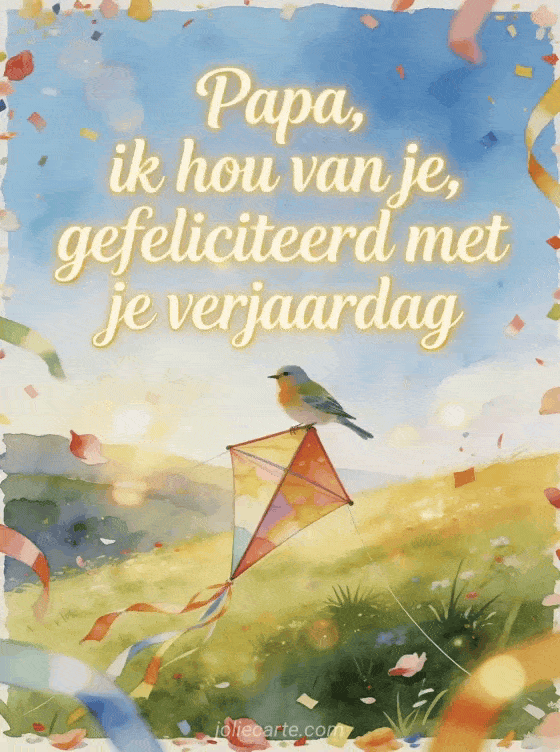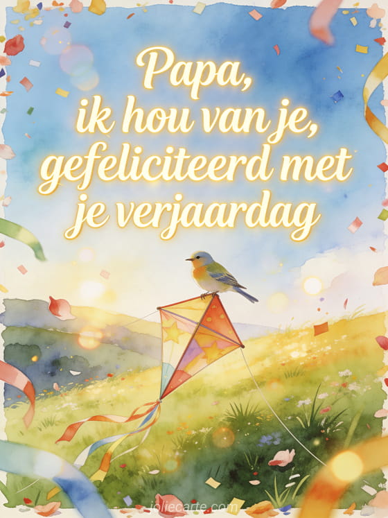 Deel een boodschap met ik hou van je gefeliciteerd met je verjaardag papa in een zonnige aquarelweide, met een kanarievogel op een grote feestelijke vlieger en linten, bloemblaadjes en confetti over de rand. Kies ook voor papa's verjaardag, verjaardag papa tekening of je dochter gefeliciteerd met je verjaardag papa van je dochter.