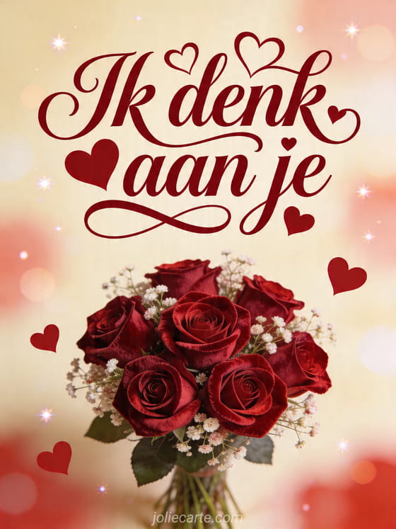 Stuur een tedere kaart met Ik denk aan je om je liefde en gemis op een warme manier te delen. Ontdek ook een goedemorgen lieverd ik denk aan je, een ik droom van je ik denk aan je of een fijne dag lieverd ik denk aan je.