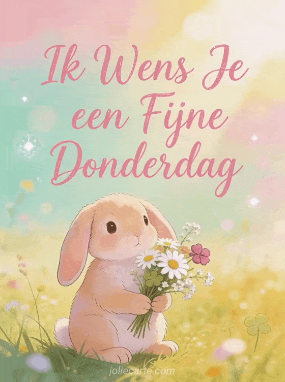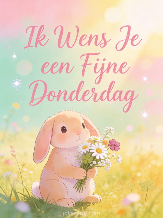 Stuur een schattige fijne donderdag wens van een adorable konijn met een bosje wilde bloemen in een zonnige weide. Ontdek ook een fijne donderdag minion gif of een fijne regenachtige donderdag kaart.