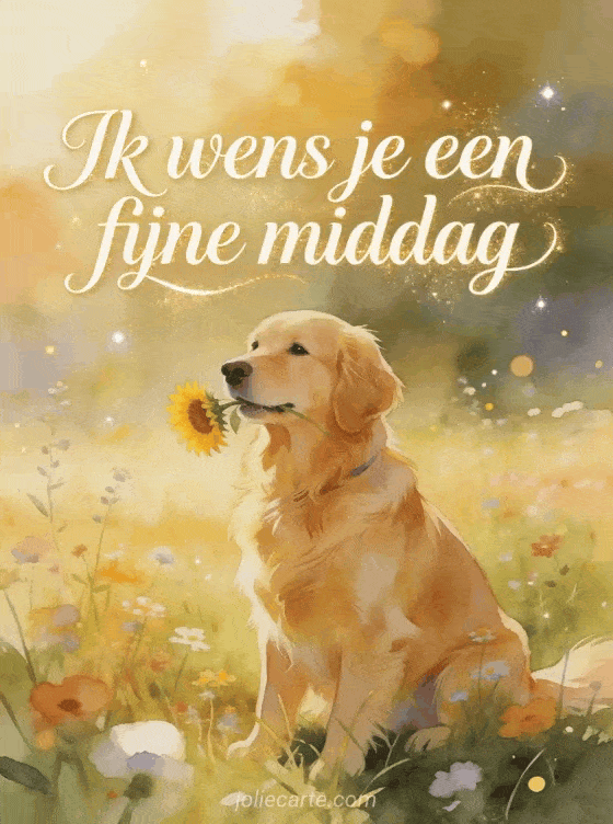 Stuur een hartelijke fijne middagwens met een charmante golden retriever die zit in een weide vol zonnebloemen in warm namiddaglicht. Bekijk ook een fijne middag.