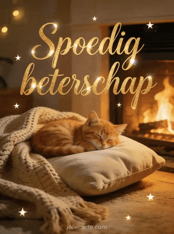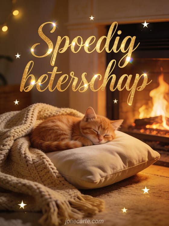Stuur een warme en gezellige kaart met een slapend roodharig katje bij een open haard om iemand spoedig beterschap te wensen. Bekijk ook een beterschap kaart.
