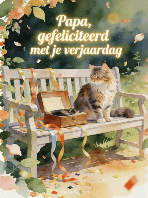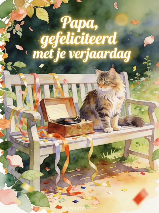 Deel een verjaardagsgroet voor papa van zijn dochter met een Maine Coon kat, een open muziekdoos en feestelijke linten op een tuinbankje. Kies ook voor brief voor papa's verjaardag, fijne verjaardag mijn lieve papa of fijne verjaardag voor papa.