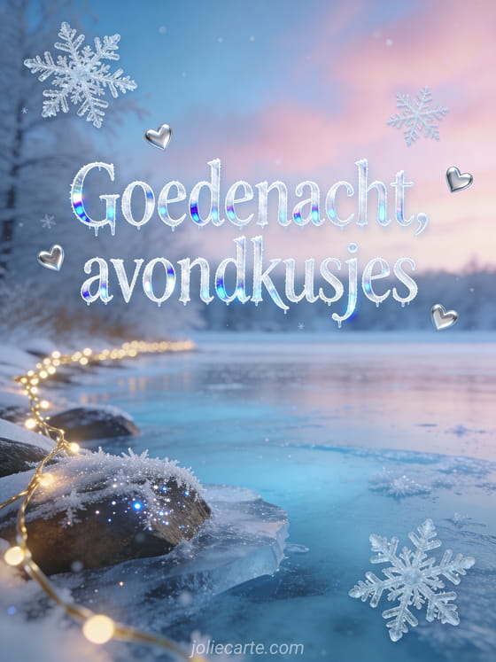 Stuur een tedere goedenacht groet met avondkusjes via een lumineuze winterillustratie met een bevroren meer en gouden lichtjes langs de oever. Bekijk ook een foto's om goedenacht te wensen of een mooi bericht goedenacht voor jouw schat.
