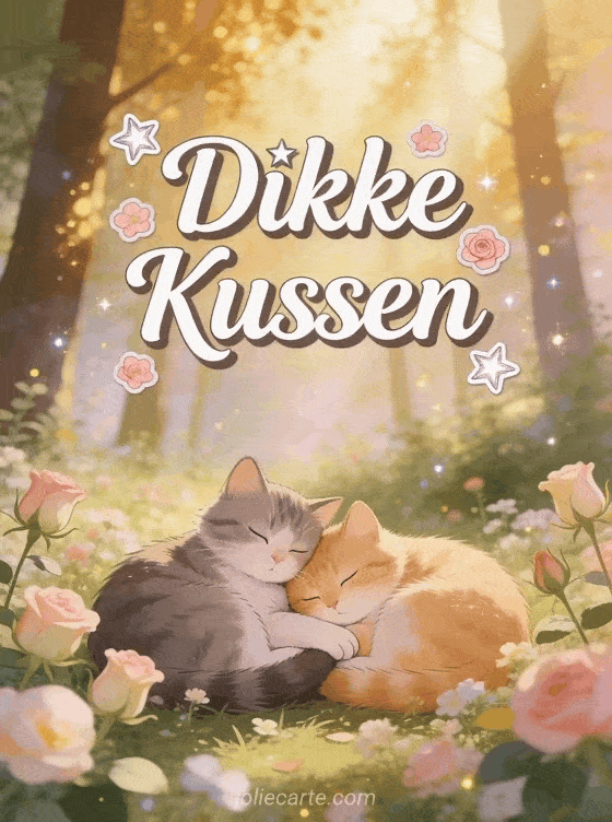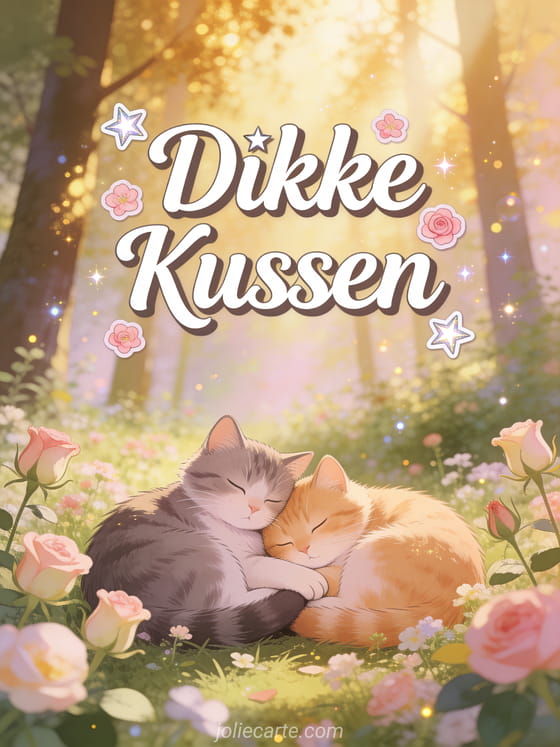 Deel de liefde met deze schattige kaart met dikke kussen en twee katten die nestelen in een bloemrijke open plek. Ontdek ook tedere kusjes geanimeerd of dikke knuffelzoenen katten.