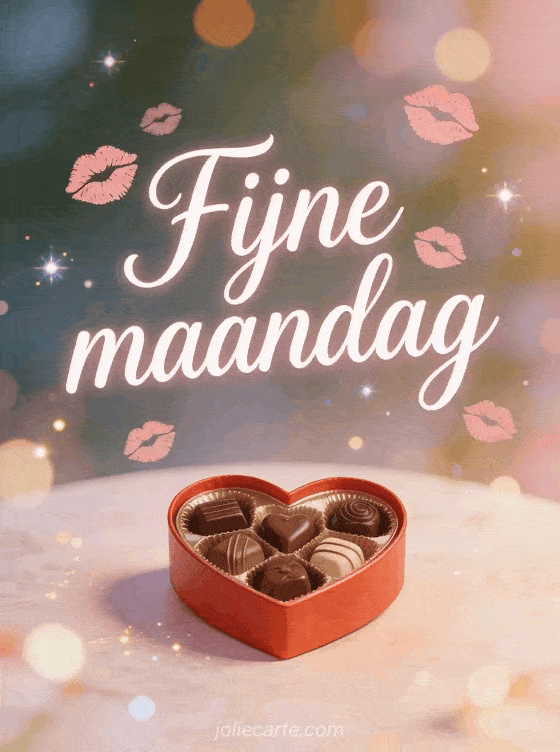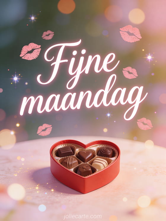 Deel een lief kaartje voor een fijne maandag met kusjes en een hartvormige bonbondoos. Een romantische en liefdevolle manier om de week te beginnen. Ontdek ook een kaart fijne positieve maandag of een kaart fijne dag maandag.