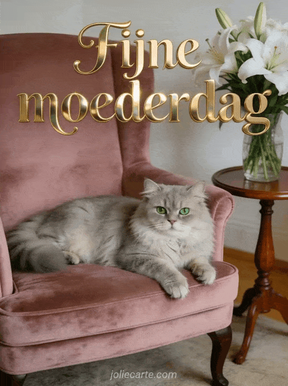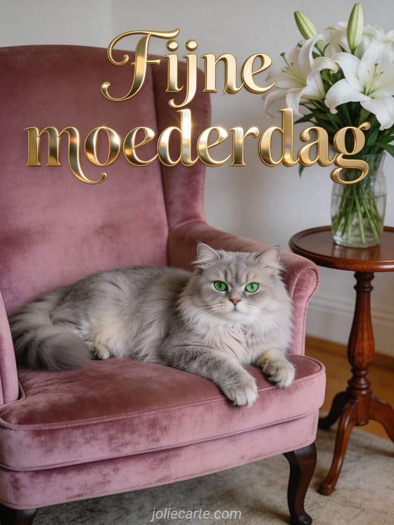 Verras mama met deze elegante moederdagkaart, versierd met een prachtige Perzische kat op een fluwelen fauteuil en witte lelies. Bekijk ook een bericht voor moederdag of een gedicht moederdag.